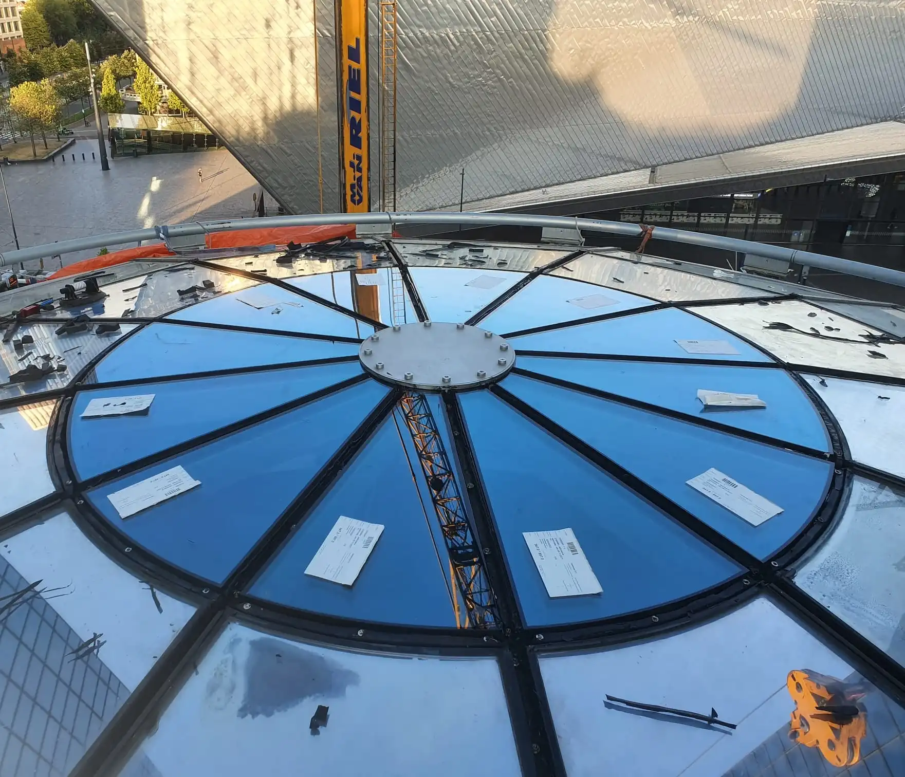 We werkten met gespecialiseerd materieel op hoogte, waarbij veiligheid en bereikbaarheid centraal stonden. In nauw overleg met het gebouwbeheer is de planning afgestemd op de gebruiksuren van het pand. De werkzaamheden zijn zorgvuldig voorbereid en uitgevoerd, inclusief valbeveiliging en logistieke afstemming rondom het drukke stationsgebied.